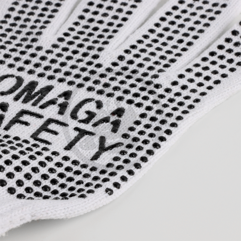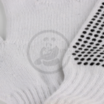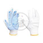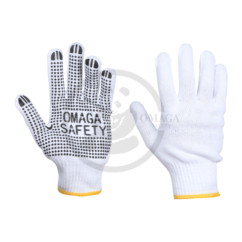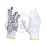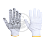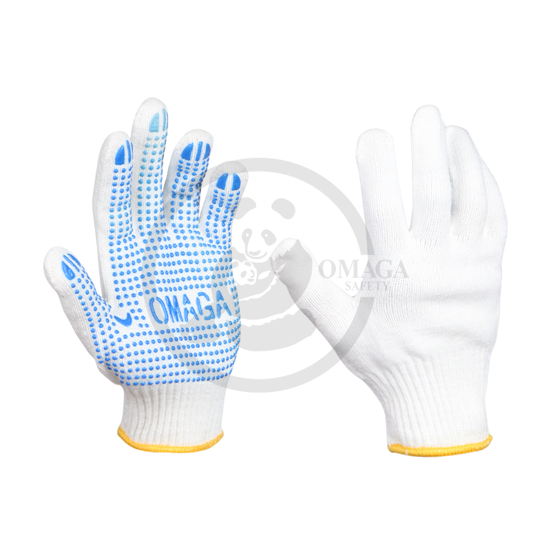 Dotted gloves made from a polycotton blend are crafted from a combination of cotton and polyester, providing a balance of softness, breathability, and durability. The gloves are often enhanced with PVC (polyvinyl chloride) dots on the palms and fingers, which offer superior grip and control. These gloves are ideal for tasks like handling slippery objects, assembly work, packaging, or light industrial tasks. The polycotton material ensures comfort and flexibility, while the PVC dots help prevent slipping and provide extra traction, making them perfect for tasks that require a firm, non-slip hold.