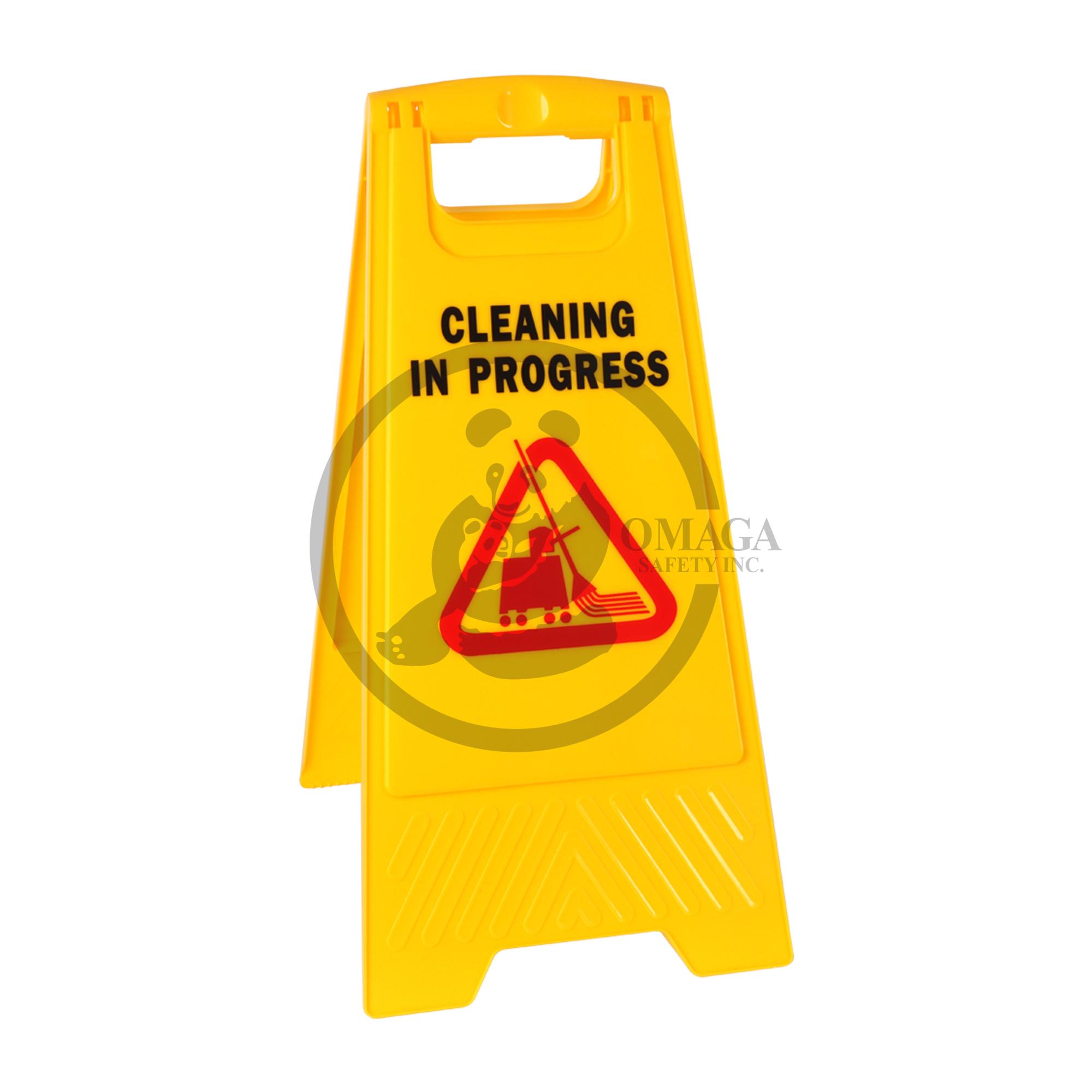 Features: Cleaning in progress two-sided floor sign, easy to carry with handle grip, high visibility bright yellow color to warn people